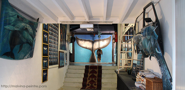 La performance de Malvina, consiste à représenter, dans un langage non verbal, une image de parfaite harmonie entre l’homme et la baleine avec un sentiment d’allégresse procuré par l’énergie vitale du cétacé. L’artiste qui a peint « La Queue de la Baleine » sur une toile de 12 m² prend en photo celles et ceux qui le souhaite devant son œuvre.